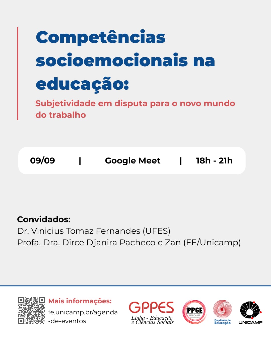 Link para inscrição: https://www.fe.unicamp.br/agenda-de-eventos/competencias-socioemocionais-na-educacao-subjetividade-em-disputa-para-o-novo-mundo-do-trabalho/